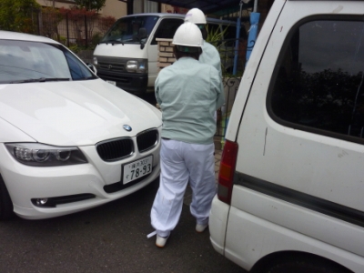 現場に付いてみると、車の中には、現場監督の一級塗装技能士の竹内さんと、ダイさんがすでに到着されていて、挨拶をしようと車の中を見たらそれはもうビックリしました。