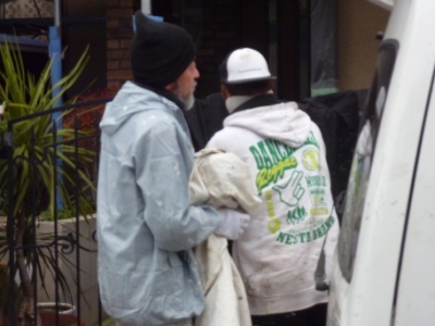 作業初め、塗料を準備するダイさんの横で、竹内さんとカズさんが門のあたりに布シートを掛け始めました。