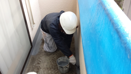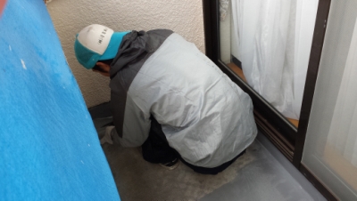 今度は先ほど外壁塗装をしていた竹内さんも持っていたようなプラスチックのバケツに、さっきよりもゆったりとしたウレタンを入れて、また、私と佐藤さんがベランダ内へ入ります。