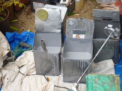 。見よう見まね、持ち上げた一斗缶は、前回の塗料の重さを思い出しつつもったのですが、分量が少ないせいなのか、それともウレタンが軽いのか、思ったよりも重たくはなかったのを覚えています。それでも十分重たかったのですが。