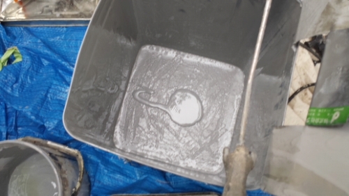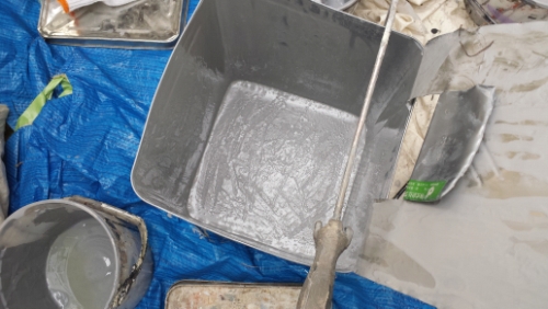 これが程良い状況ならいいですが、下手をすると、下でネタを練って、ベランダまで持ち上げる段階で硬化してしまって、塗料に使えない……なんて状況もあるそう。